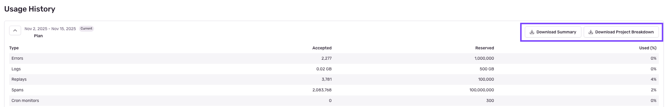 You can download spreadsheets with project breakdowns or summary reports by navigating to Organization Settings (left sidebar) → Subscription → Usage History. From there, choose your desired billing period from the dropdown menu, then select Download Summary or Download Project Breakdown: