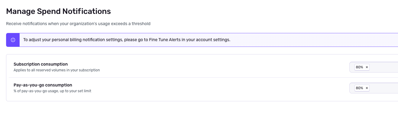 - NOTE: The configuration of the spend notifications thresholds (e.g. receive notifications on at least 80% quota consumed) is done on the Subscription settings page of the organization. See above on how to configure this.