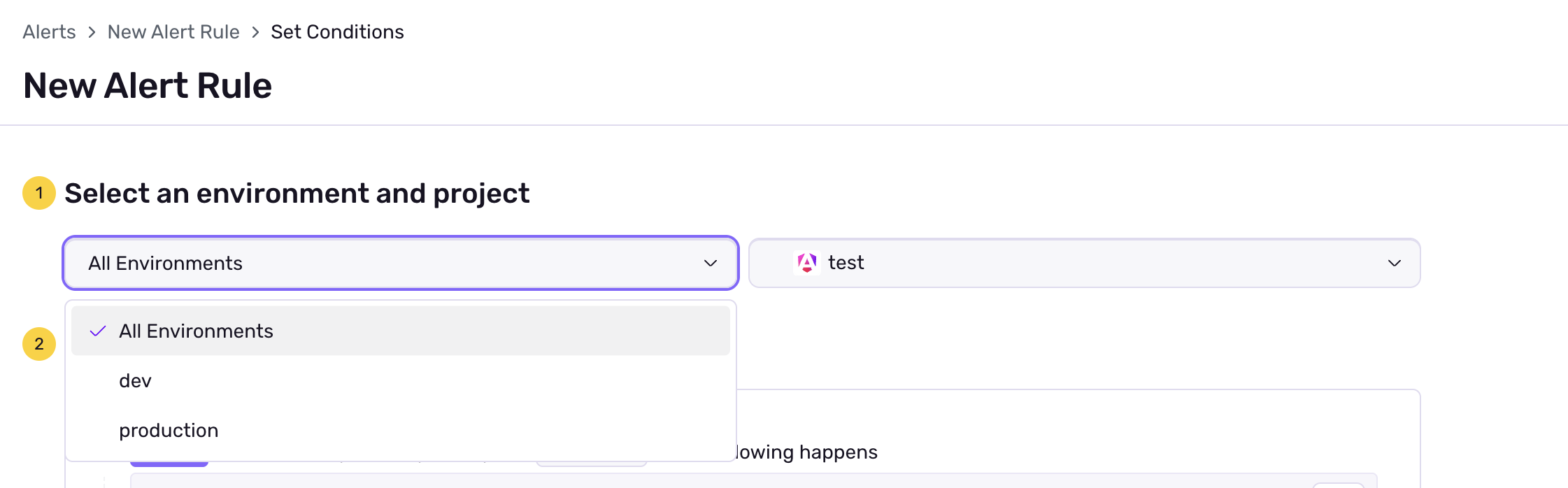 From your Sentry project, go to Alerts in the left-hand sidebar. Select Issue Alerts, then click Create Alert Rule, or open an existing alert to edit it. When prompted, select Issue Alert. At the top, you can find the environment selector: