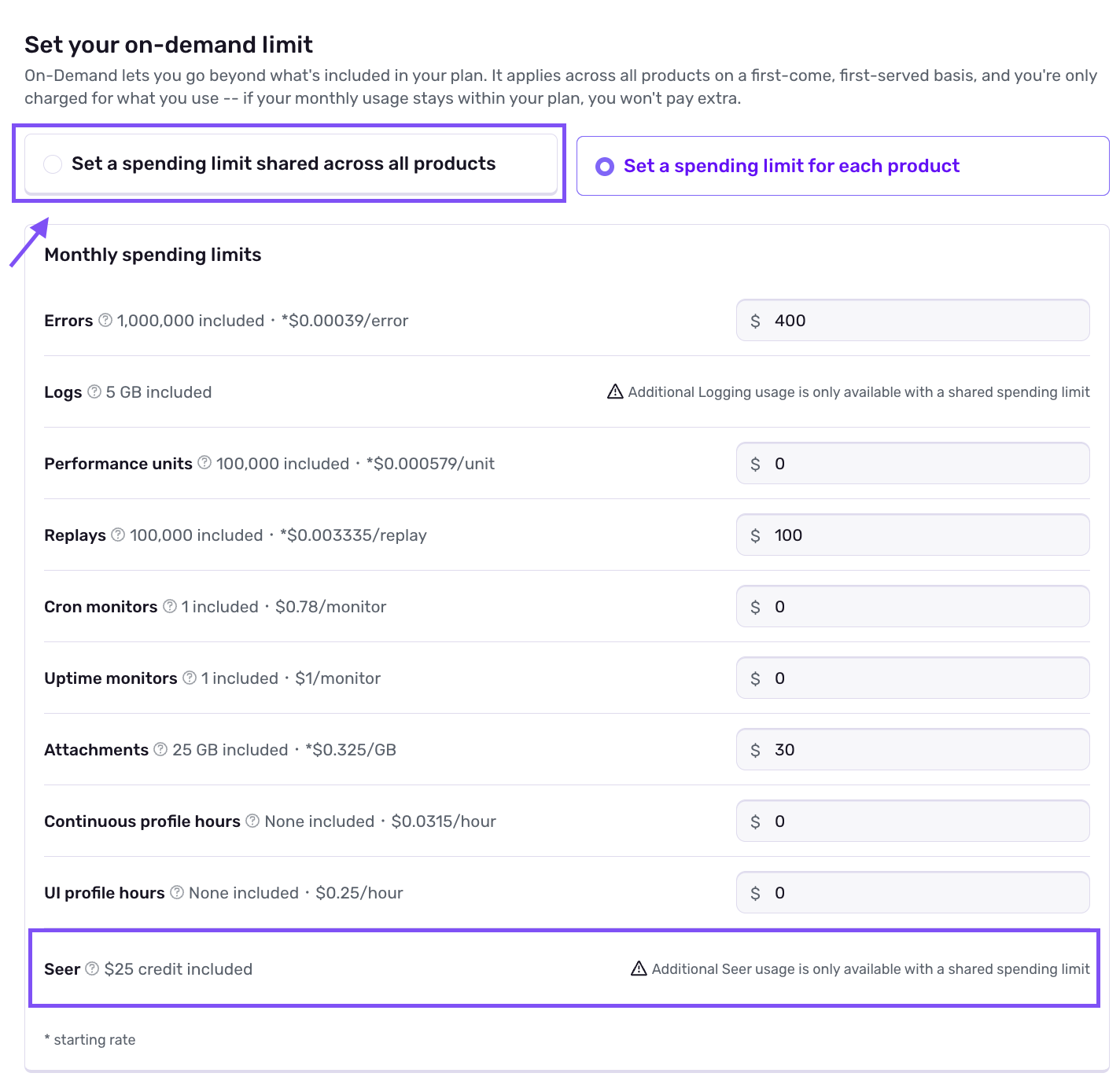If you're on a legacy plan with per-product on-demand budgets, you'll need to set a shared on-demand budget.