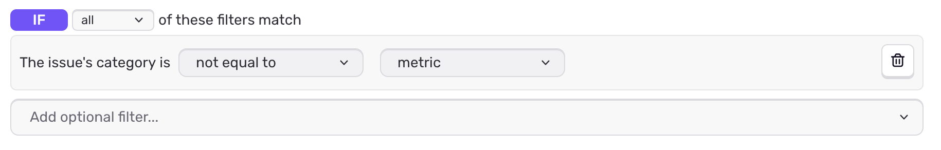 You can use the following filters to ensure that an alert is only triggered by issues of a specific type or category: